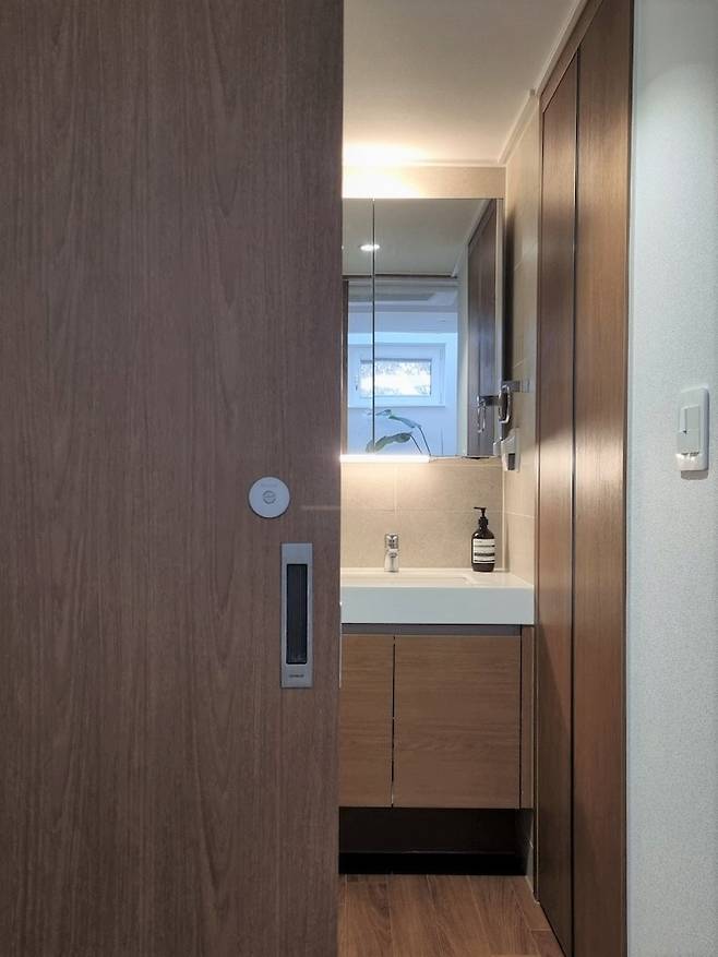 슬라이딩 문 안쪽에는 파우더룸, 욕실, 남편의 드레스룸이 있습니다.