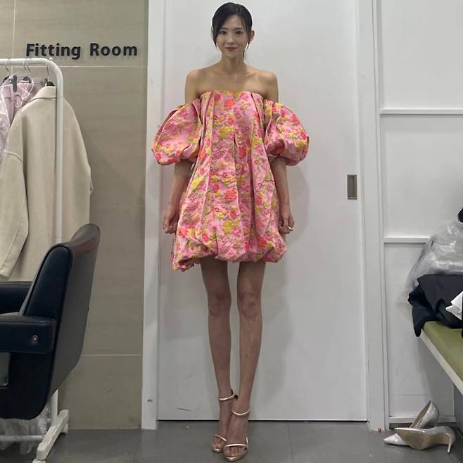 핑크 플로럴 패턴의 오프숄더 드레스로 페미닌한 매력을 극대화하고 있다. 볼륨감 있는 퍼프 슬리브와 미니 길이의 조합이 사랑스러운 분위기를 만들어내며, 화려한 꽃무늬 프린트가 봄날의 로맨틱한 감성을 완벽하게 표현하고 있다.