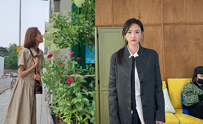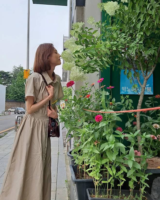 베이지 톤의 셔츠 드레스로 편안하면서도 세련된 일상 룩을 완성하고 있다. 허리 부분의 개더 디테일이 여성스러운 실루엣을 만들어내며, 자연스러운 소재감이 야외 활동에 적합한 편안함을 연출하고 있다. 꽃과 식물이 있는 거리에서의 모습은 도시적 감성과 자연스러운 매력을 동시에 보여주고 있다.