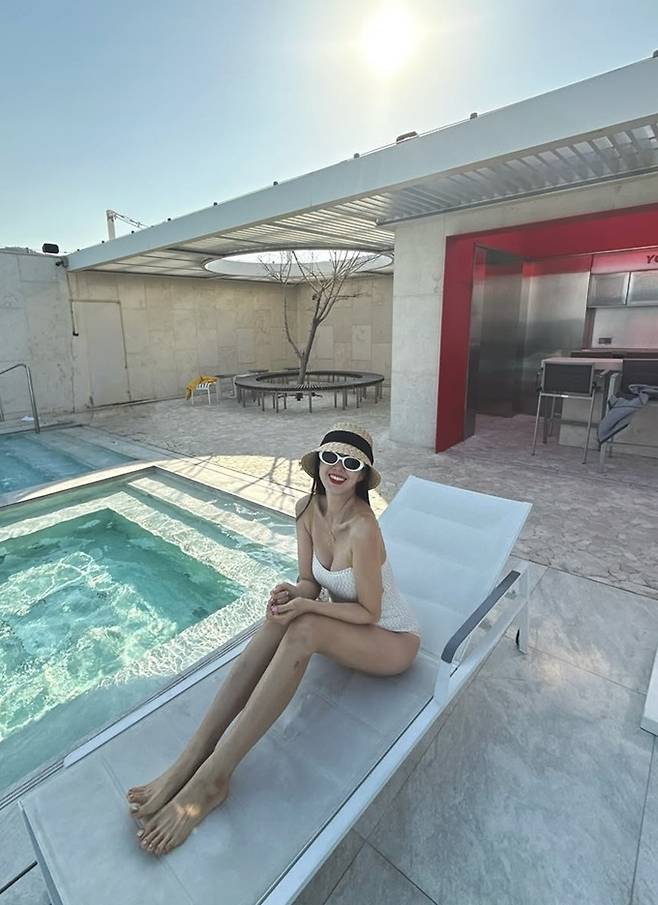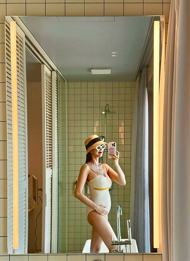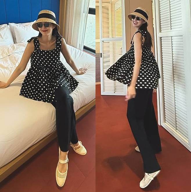 쌍둥이 둘째를 임신한 배우 지소연이 수영복과 땡땡이 미니 원피스의 임산부룩으로 러블리한 미모를 선보였다.