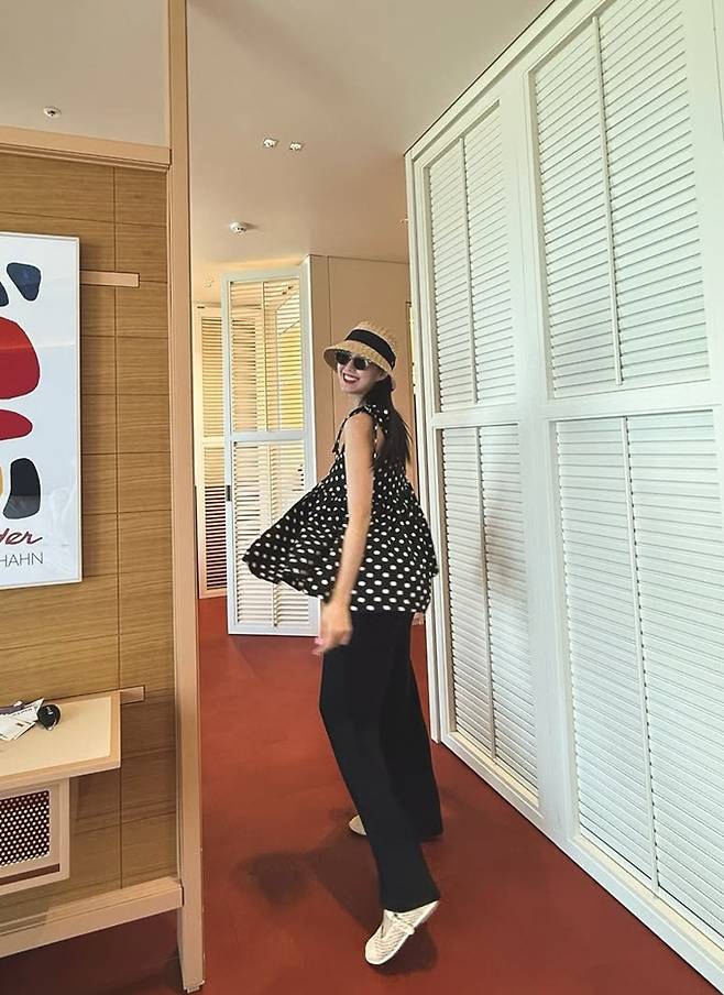 공개한 사진에서 지소연은 살짝 배가 나온 원피스 수영복과 땡땡이 미니 원피스로 러블리하면서도 귀여운 임산부룩을 완성했다.