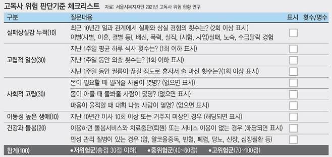 국민 10명 중 3명 이상이 ‘나는 고독사할 가능성이 있다’고 한국보건사회연구원의 최근 설문조사에서 답했다. “가족·친척 등 주변 사람들과 단절된 채 홀로 살다 임종을 맞고 시신이 일정시간이 흐른 뒤에 발견되는 죽음”으로 정의되는 ‘고독사’가 남일 같지 않다는 것이다.