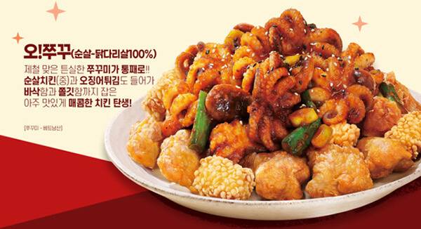 치킨 프랜차이즈 치킨매니아는 색다른 미식 경험을 선사할 신메뉴로 ‘오 쭈꾸’를 전국 매장에 출시했다. 오 쭈꾸는 매콤한 특제 양념에 버무려진 순살 닭다리살과 쫄깃한 쭈꾸미 위에 크런치 오징어 튀김을 더한 이색적인 조합이 특징이다. 부드러움, 쫄깃함, 바삭함이 조화롭게 어우러지며, 한입 먹을 때마다 다양한 식감과 깊은 풍미를 느낄 수 있다. 밥과 함께 먹으면 든든한 한 끼가 되고, 안주로 즐기기에도 좋다. 가격은 26,900원이다.