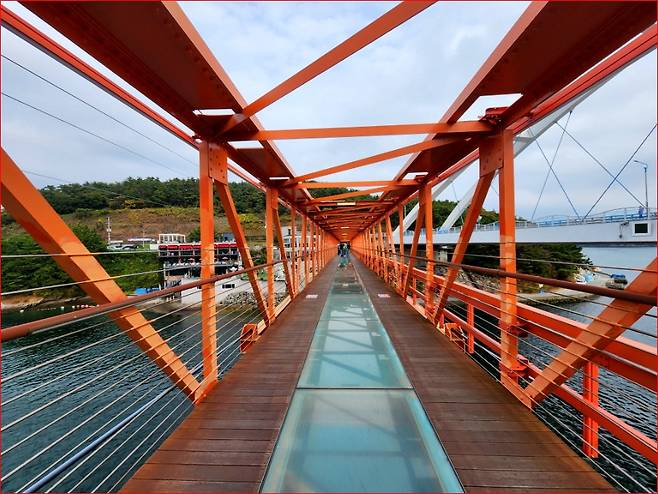 저도를 대표하는 명소는 단연 이 다리입니다. 정식 명칭은 저도 연륙교, 1987년에 완공된 철제 교량으로 길이 70m, 폭 3m 규모예요. 이 다리는 육지의 구산면과 저도를 잇는 유일한 통로가 자창원의 상징적인 포토존으로 유명합니다. 무엇보다 다리 중앙에서 13.5m 아래로 내려다보이는 바다 풍경이 압권이죠. 투명한 바닥판을 통해 바닷속까지 훤히 내려다볼 수 있어 마치 바다 위를 걷는 듯한 아찔함을 선사합니다.