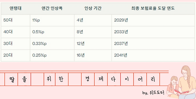보험료율 인상은 세대별로 차등화됩니다. 제가 속한 40대의 경우 매년 0.5%포인트씩 인상된다고 합니다. 아래 표를 보시면 이해가 쉬우실 거예요.