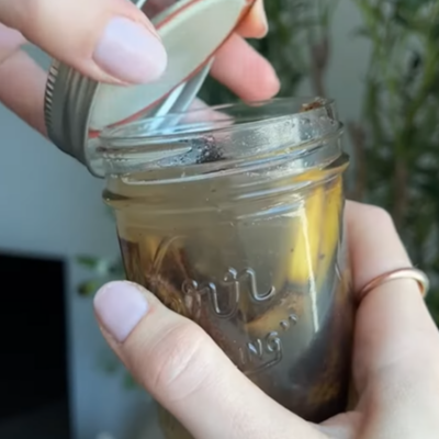 껍질을 가위로 2~3cm 크기로 잘라 유리병이나 플라스틱 병에 넣고, 껍질이 잠길 만큼 물을 채워주세요.