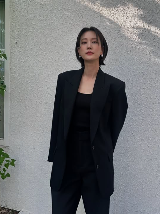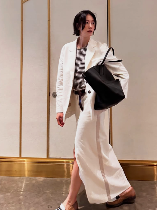 허리에는 브라운 벨트를 매치해 실루엣에 포인트를 더했고, 상의로 선택한 화이트 재킷은 전체적인 톤온톤 룩을 완성했다.