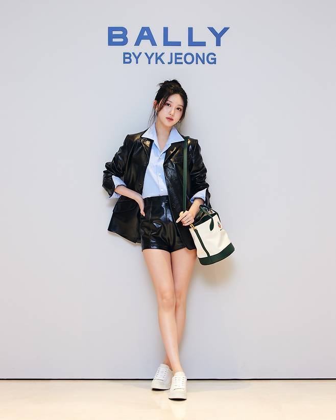 다음은 레더 자켓 & 숏팬츠에 블루 셔츠 그리고 발리 엠블런 프린트 버킷백, 레더 스니커즈를 착용해 시크 & 캐주얼룩을 완벽히 소화한 아이브 가을!