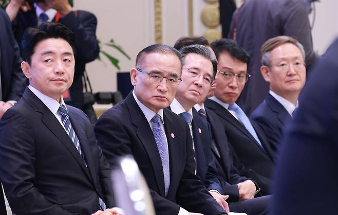 | ▲ 3일 청와대 영빈관에서 열린 이재명 대통령의 '대통령의 30일, 언론이 묻고 국민에게 답하다' 기자회견에 강훈식 대통령비서실장 등 참모진이 배석해 있다. [대통령실통신사진기자단] |