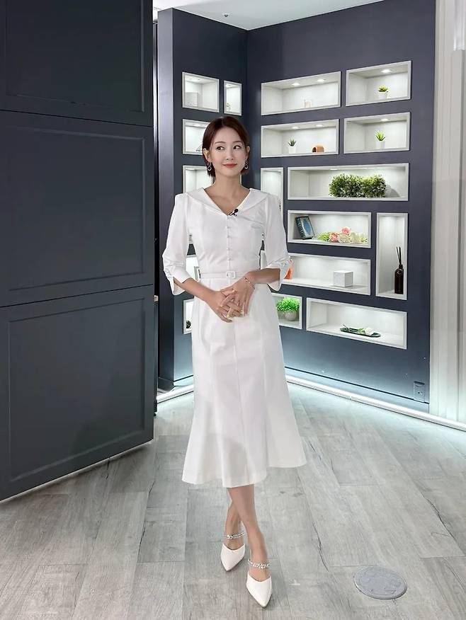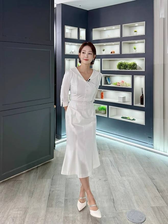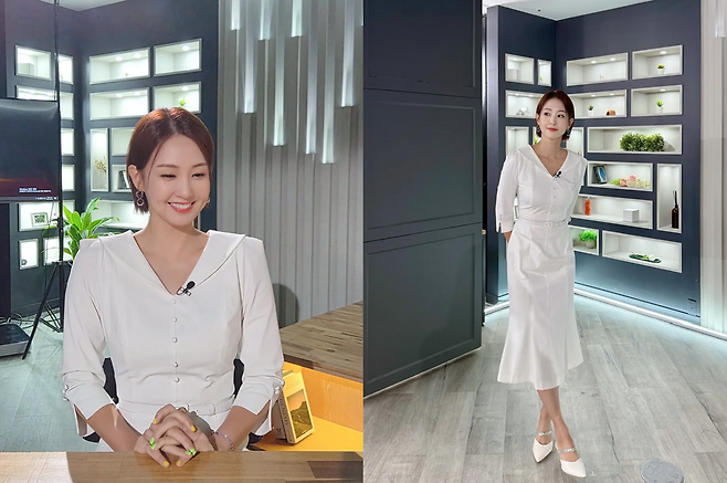 여기에 깔끔한 화이트 원피스와 보석 장식의 구두를 매치하여 군더더기 없이 우아한 아나운서 룩의 정석을 보여주었습니다.