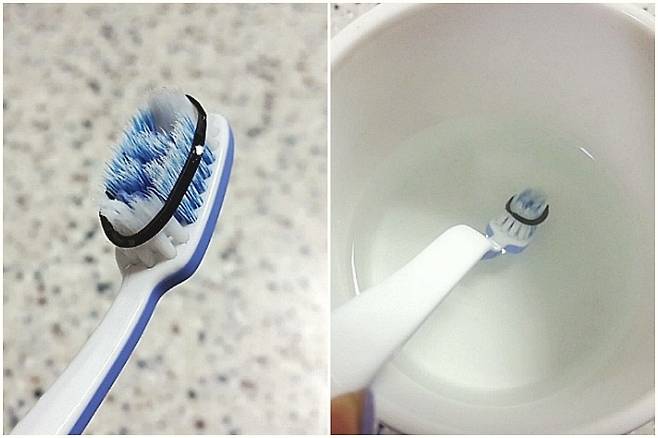 칫솔모를 작은 고무 머리끈으로 감아주시고요. 뜨거운 물에 살살 흔들면서 1분 정도 담가보세요. 뜨거운 물에 소금을 약간 넣어주시면 살균효과도 있어요.