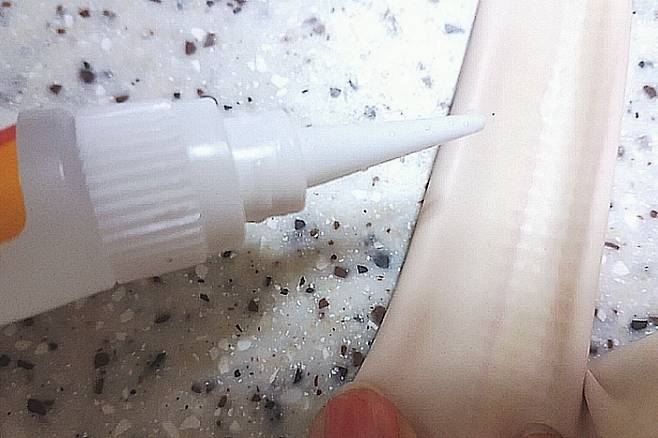 이럴 때 고무장갑을 뒤집어 주시고 구멍 난 부분에 순간접촉제를 톡 떨어뜨려 주세요. 이대로 잘 말려주시면 끝!