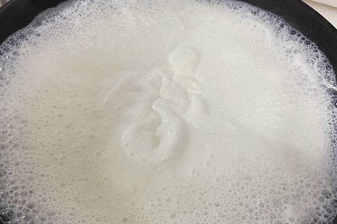 끓인 우유를 버리면 위 사진처럼 우유막이 형성되는데요. 이렇게 우유를 끓이면 우유 속 지방성분이 코팅 벗겨진 흠집 사이를 채워서 코팅을 되살리는 효과를 준다고 하네요.