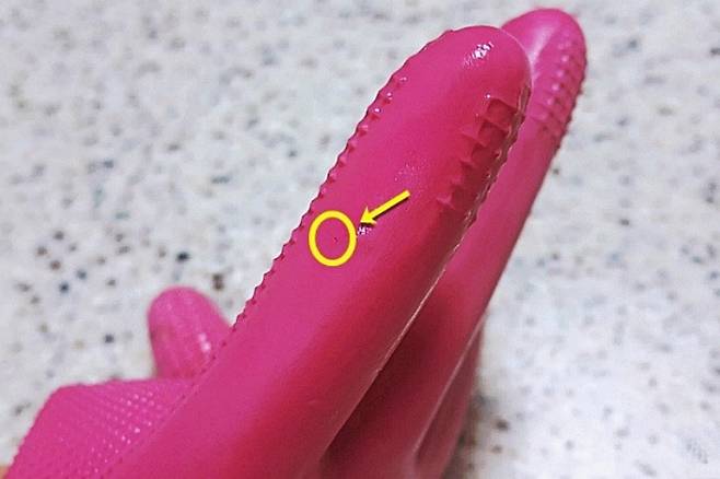 평소처럼 설거지를 하는데 물이 새는 것 같더라고요. 고무장갑에 바람을 빵빵히 넣어 확인해 보니 미세하게 구멍이 나있는데요. 한쪽은 멀쩡하니 그냥 버리기 아깝죠