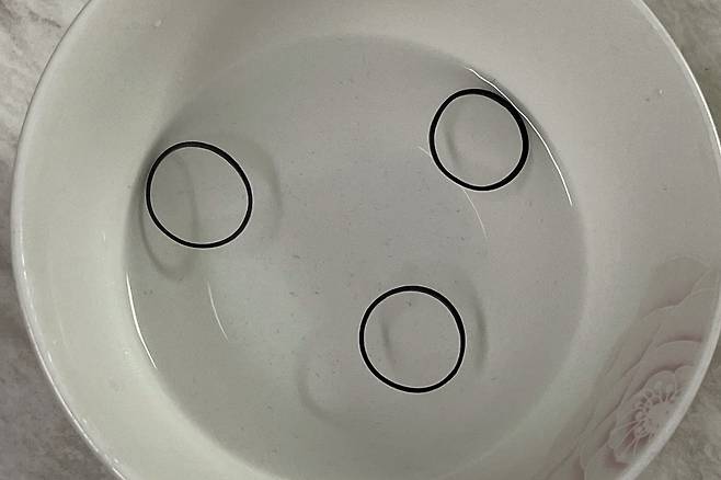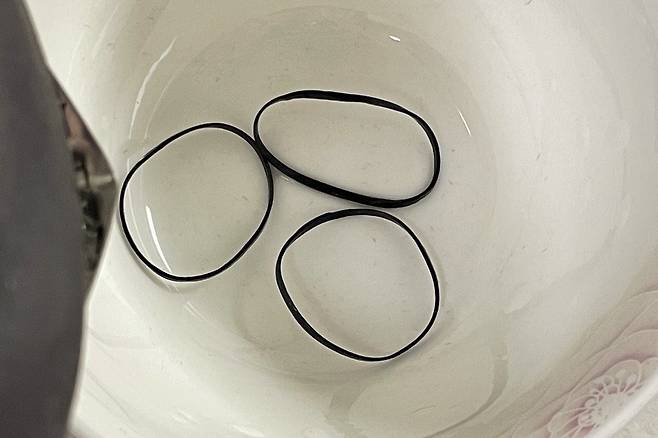 방법은 정말 간단합니다. 그릇에 늘어난 고무줄을 넣고 뜨거운 물만 부어주시면 끝이에요