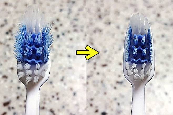 그러면 칫솔모가 다시 새것처럼 변신을 한답니다. 얼마 쓰지 않았는데 벌어져서 그냥 버려야 했는데 꿀팁이죠. 이 원리는 칫솔이 나일론 재질인데 나일론은 형상을 기억하는 성질이 있어서 뜨거운 물을 만나면 원래대로 돌아간다고 합니다.
