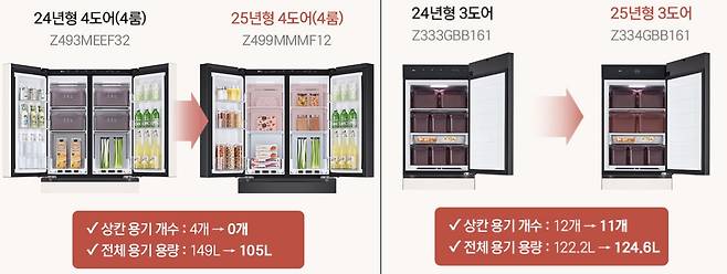 기존처럼 상칸에 용기가 있는 모델도 있으니 개인 라이프 스타일에 따라 결정하면 된다. 용기 용량을 줄이는 4도어 모델과는 다르게 3도어 모델은 상칸 용기는 1개 줄어드는 대신 전체 용기 용량은 소폭 늘어나는 방식으로 바뀌었다.