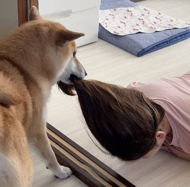 이번에는 딸의 머리를 물어 뜯는 시바견 강아지가 있습니다. 도대체 이게 어떻게 된 상황인지 궁금해도 너무 궁금합니다.