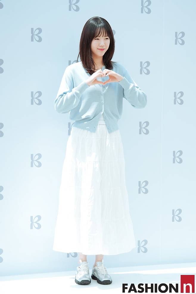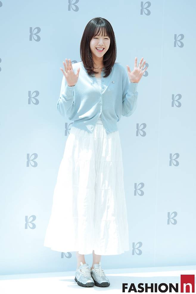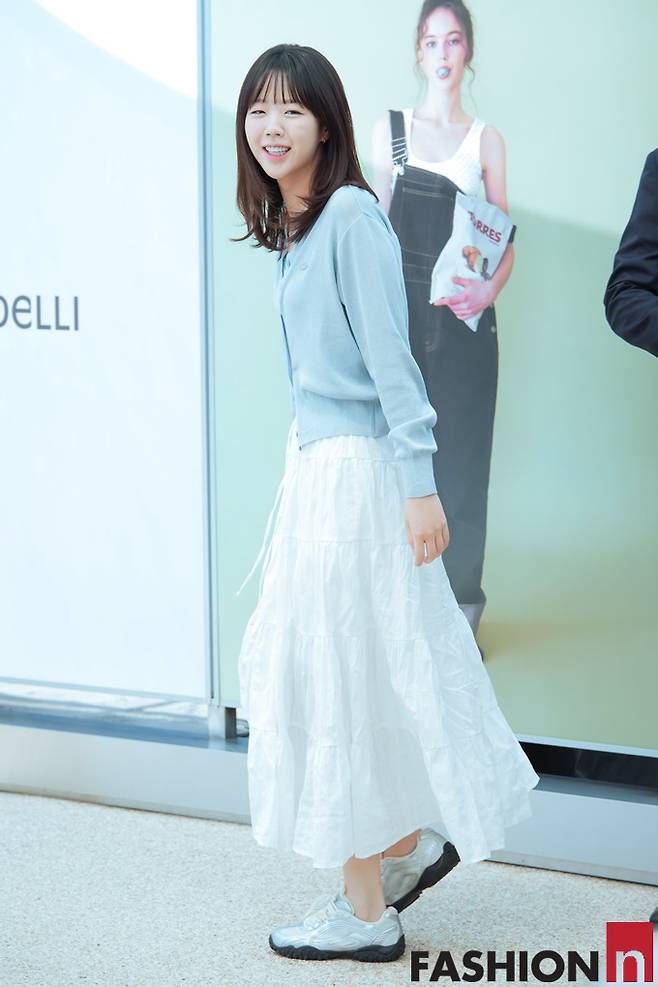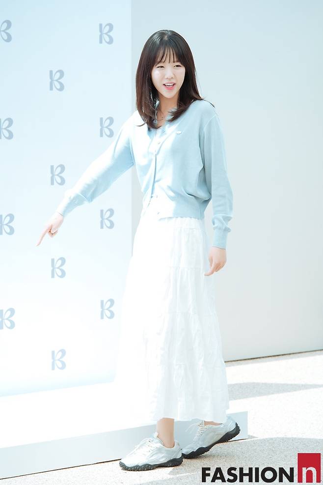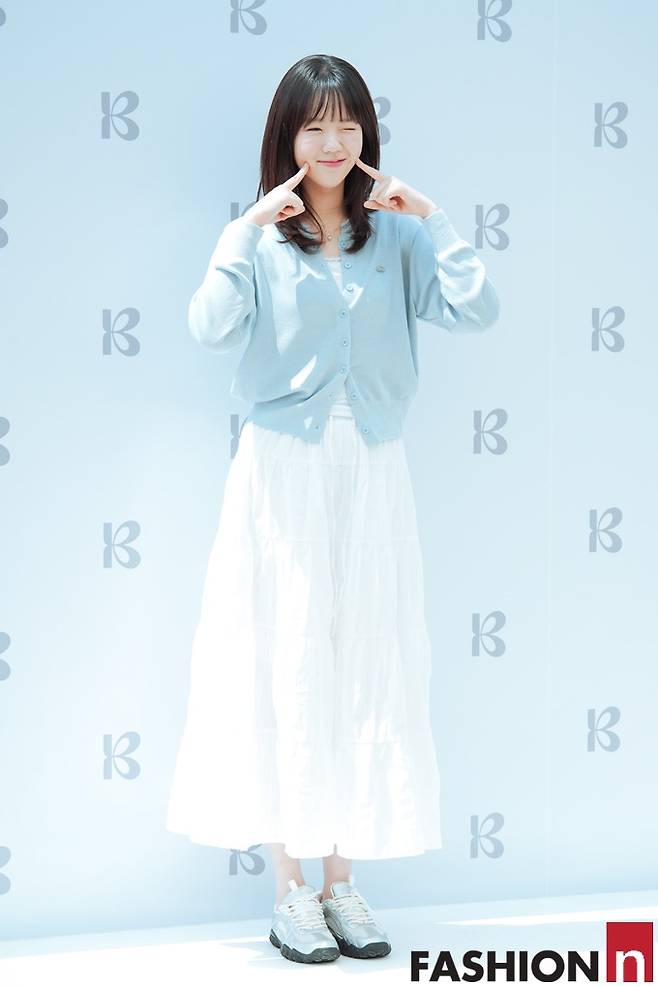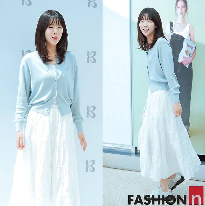지예은은 하늘색 니트 카디건에 화이트 티어드 롱 스커트를 매치해 부드러운 이미지에 청초한 스타일로 소녀 감성을 한껏 드러냈다.