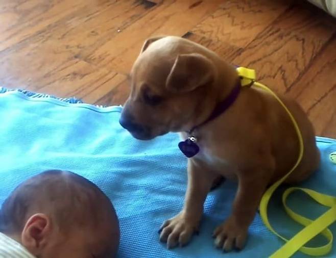 이날 공개된 영상에 따르면 강아지 캘리는 핏불과 카타홀라 믹스종이라고 합니다. 잠든 아기 옆에 앉아 자리를 지킨 녀석.
