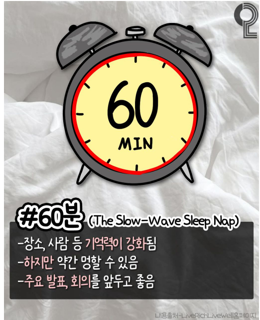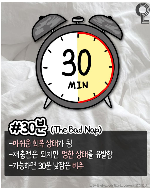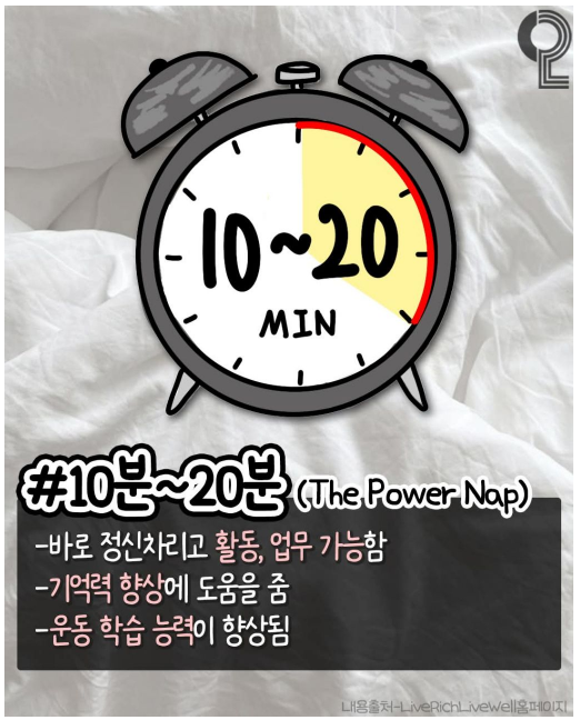 ✅ 최적 낮잠 시간은 15~25분입니다.너무 길면 오히려 더 피곤하고, 밤잠에 영향을 줄 수 있어요.