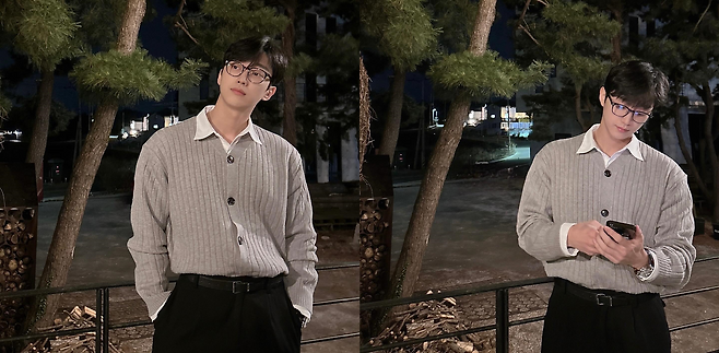 진영님은 흰 셔츠에 회색 가디건을 매치하고, 클래식한 디자인의 테츠오 안경으로