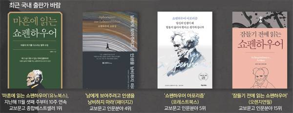 ‘염세주의’ 철학자로 알려진 쇼펜하우어 바람이 최근 국내 출판가에서 거세게 불고 있다. 강용수 고려대 철학연구소 연구원이 쓴 ‘마흔에 읽는 쇼펜하우어’(유노북스)는 지금까지 수십만 부가 팔리면서 지난해 11월 셋째 주부터 올해 1월 셋째 주까지 10주 연속 교보문고 종합베스트셀러 1위를 지켰고, 이번 주에도 2위에 올라 있다. 그의 책 ‘소품과 부록’을 편역한 ‘남에게 보여주려고 인생을 낭비하지 마라’(페이지2)와 ‘쇼펜하우어 아포리즘’(포레스트북스) 등도 역시 상위권을 휩쓸고 있다.
