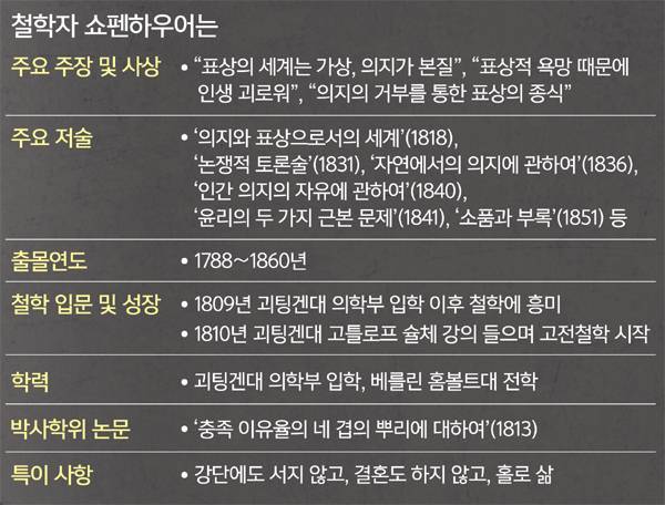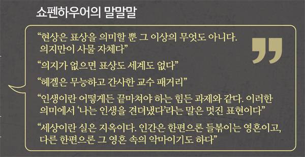이뿐은 아닐 것이다. 현대를 사는 우리가 곱씹어야 할 주장이나 지혜, 그의 인상적인 삶 등 다양한 측면도 있을 것이다. 강 연구원은 책에서 “그의 철학은 위로를 주지 않는다. 대신 삶의 지혜와 깨달음을 준다. 아울러 행복을 자기 밖이 아니라 자기 안에서 찾는 법을 알려준다”고 했다. 단순한 열풍의 배경을 아는 것을 넘어서 쇼펜하우어의 삶과 철학, 사유의 여정 속으로 파고들어야 하는 이유다.
