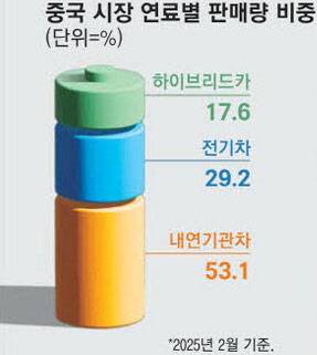 그럼에도 현대차가 다시 중국 하이브리드 시장에 진출하는 것은 여전히 중국 내 하이브리드카 수요가 건재하기 때문이다. 중국승용차연석회의(CPCA)에 따르면 올해 2월 기준 중국 시장 연료별 판매량에서 하이브리드카는 17.6%를 차지한다. 내연기관차가 여전히 53.1%로, 전기차 비중은 29.2%를 기록했다.