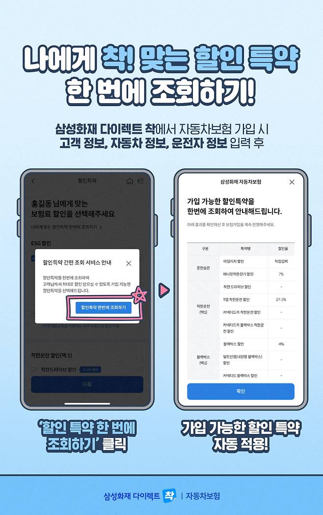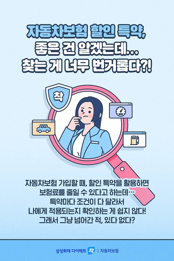 나에게 맞는 자동차보험 할인 특약, 번거롭다 고민하지 말고 삼성화재 다이렉트 착의 ‘할인 특약 한 번에 조회하기’ 기능으로 간편하게 확인해 보세요!