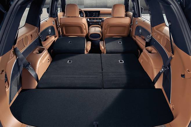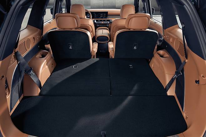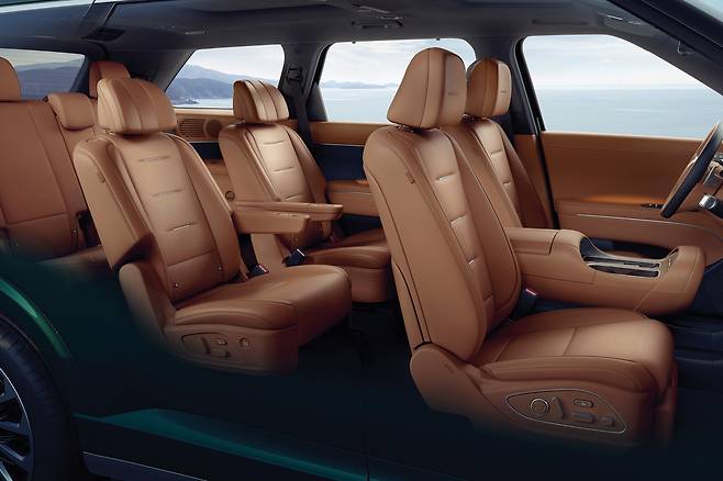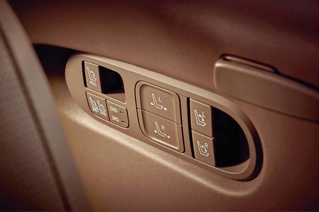 7인승의 시트 구조는 2+2+3. 즉 2열에 독립시트가 들어간다. 최상위 트림답게 옵션은 초호화다. 1·2·3열 열선과 1·2열 통풍 기능, 2·3열 전동식 폴딩·언폴딩, 2열 전동식 원터치 틸팅형 워크인 및 다이내믹 바디케어 시트까지 빼곡하다. 뒷좌석 전용 공조장치 패널과 송풍구는 천장에 자리했다. 센터콘솔이 움직이는 9인승 모델과의 호환성을 고려한 배치다.
