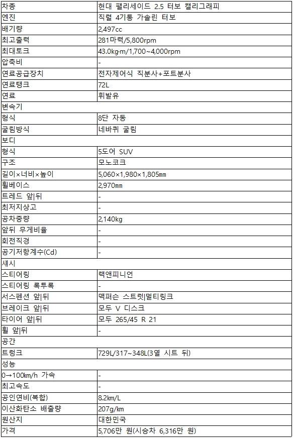 신형 팰리세이드는 파워트레인 라인업 전체를 갈아치우고 나왔다. 기존 V6 3.8L 가솔린과 직렬 4기통 2.2L 디젤 터보 엔진 대신, 직렬 4기통 2.5L 가솔린 터보 및 하이브리드로 정리했다. 시승차는 2.5 가솔린으로, 이미 싼타페 등 여러 모델에 들어갔던 엔진이다. 최고출력과 최대토크는 281마력 및 43.0㎏·m. 복합연비는 1L당 최대 9.7㎞다(2WD, 18인치 휠, 빌트인캠 제외 기준). 시승차는 AWD와 21인치 휠까지 더해 복합연비가 8.2㎞/L다.