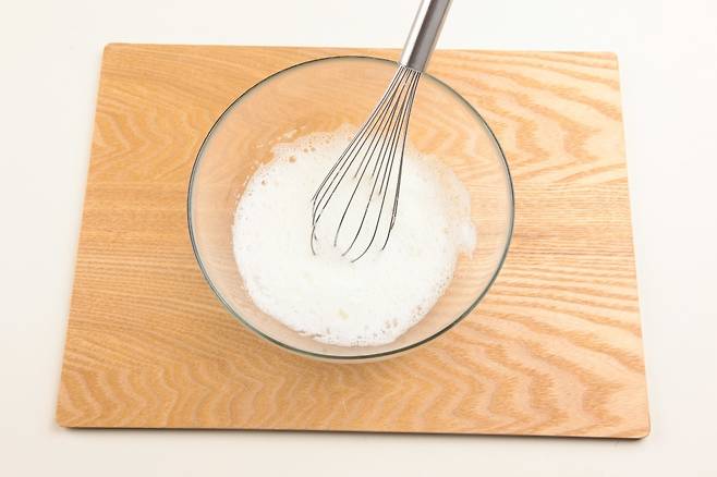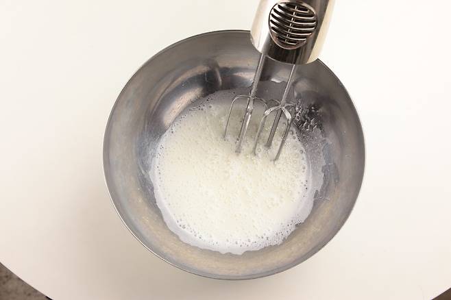 3. ②에 레몬즙을 넣고 핸드믹서 또는 거품기로 단단하게 거품을 만든다.