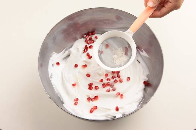 4. 단단해진 머랭 위에 전분을 채에 쳐 뿌린 후, 석류알 20~30개가량 넣은 뒤, 머랭의 부피가 줄지 않도록 조심스럽게 잘 섞는다.