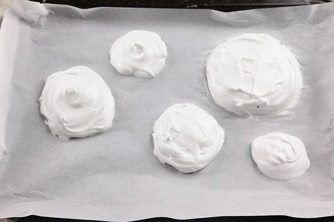 5. 유산지에 지름 10㎝정도 원을 만들어 뒤집고, 그 안에 머랭을 잘 펴 바른 다음, 오븐에 40분 동안 굽는다.