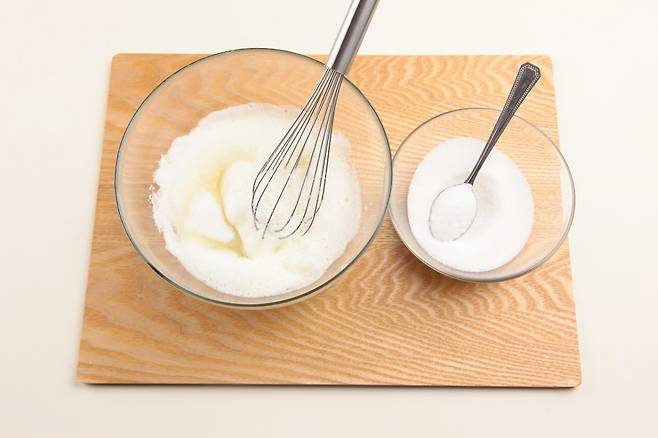 2. 달걀흰자 거품에 설탕이 잘 녹을 수 있도록 1큰술씩 넣어가며 젓는다.