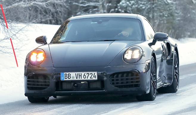 전면이 위장된 2025년형 포르쉐 911 터보 페이스리프트를 처음으로 엿볼 수 있었다. 이 차는 새로운 후미등과 새로 배열된 배기 시스템을 포함하여 후면에 대대적인 변화가 있는 것으로 오랫동안 주목을 받았지만, 프로토타입이 전면에도 변화가 있을 것이라는 사실을 공개한 것은 이번이 처음이다.