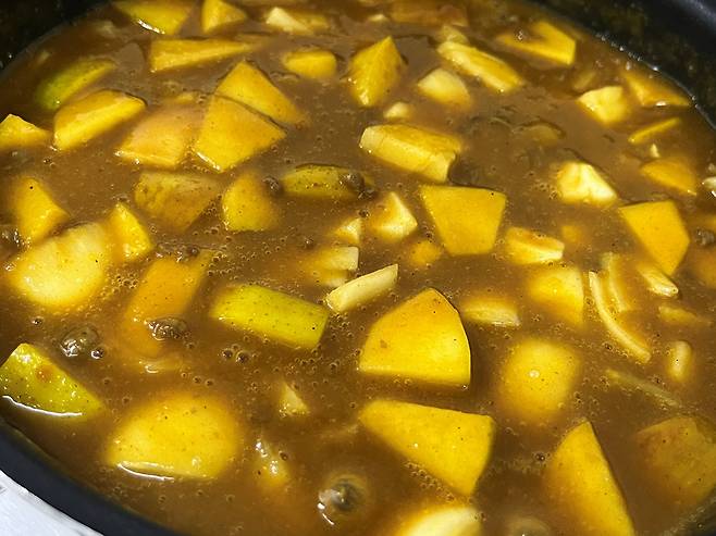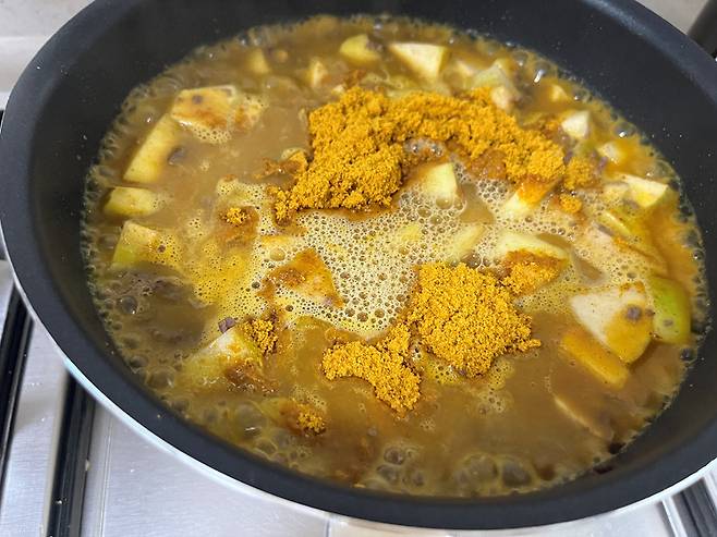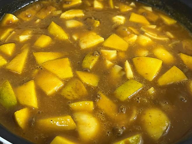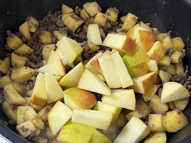 그다음 잘라 놓은 사과를 넣어 주세요. 사과를 카레에 넣는 것이 낯설 수도 있지만, 사과를 푹 익히면 신맛이 줄어들고 자연스러운 단맛과 감칠맛이 배어 나와 카레의 풍미를 한층 더 깊게 만들어 줍니다.