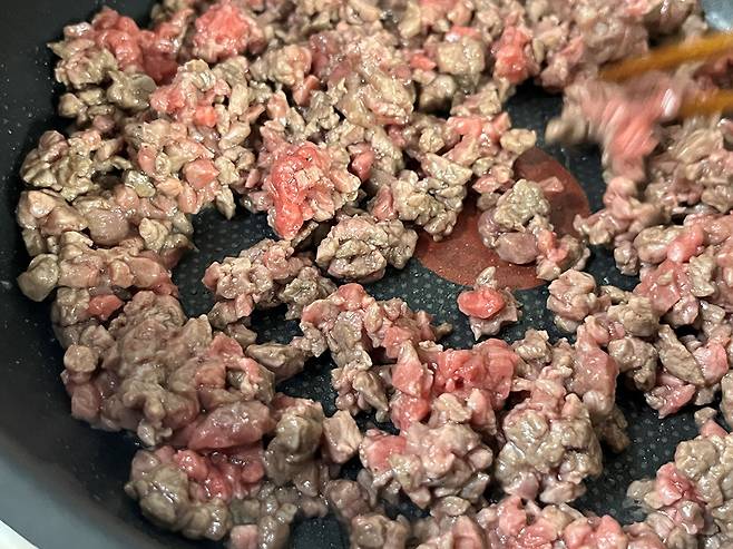 소고기는 다짐육으로 200g 준비합니다. 카레에서 고기는 꽤 중요한 역할을 하기 때문에 품질 좋은 고기로 준비해 주세요. 다짐육을 먼저 중 약불에 볶고, 소금, 후추로 밑간을 해 주세요.