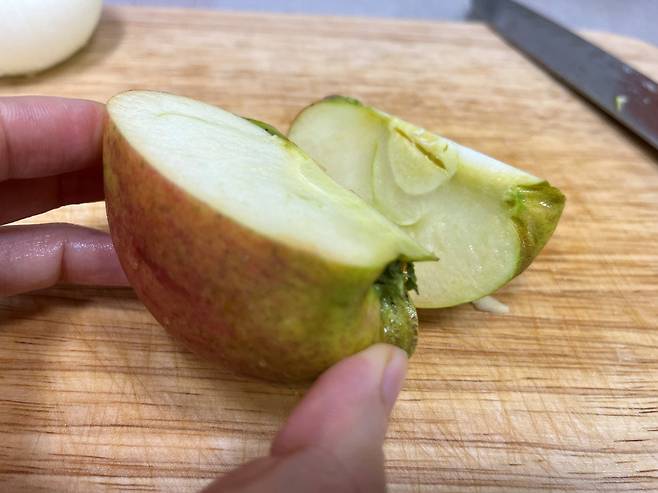 사과의 유기산 성분은 고기의 잡내를 중화해 줍니다. 특히 돼지고기나 소고기를 카레에 사용할 때 고기의 풍미는 살리고 비린 맛은 줄이는 데 효과적입니다. 또한 사과에 들어 있는 펙틴과 식이섬유는 장 건강과 소화에 도움이 됩니다.