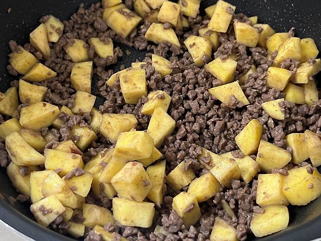 다짐육이 거의 익으면 감자, 고구마, 당근 등 딱딱한 채소를 먼저 넣고 함께 볶습니다. 저는 고구마를 넣고 고구마가 투명하고 살짝 노릇해질 때까지 볶았습니다.