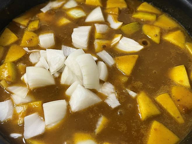 카레가 걸쭉해지면 마지막으로 양파를 넣어주세요. 양파, 파프리카 등 비교적 빨리 익는 채소는 가장 마지막에 넣어 줍니다. 그렇지 않으면 식감이 너무 물러질 수 있습니다.
