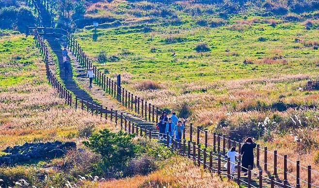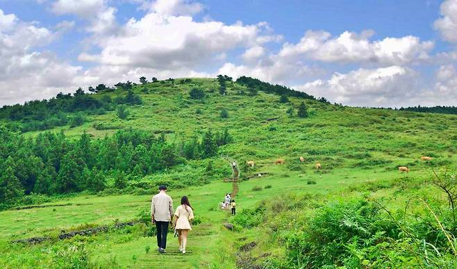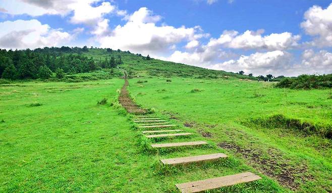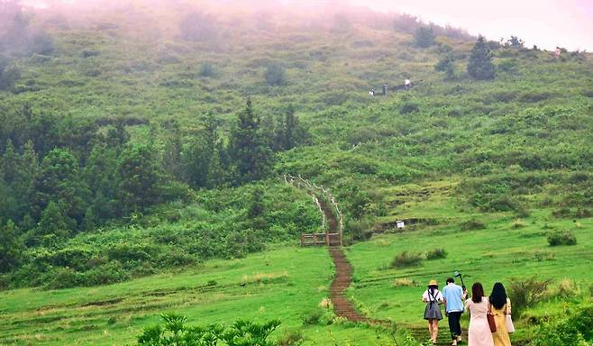 가옥을 지나 조금 더 들어가 방목 소들의 음수대를 끼고 약 30분 정도 오르면 정상에 다다를 수 있다. 경사가 낮고 길이 완만해 아이들과 함께하는 가족 여행으로도 부담 없이 오를 수 있는 것이 특징이다.