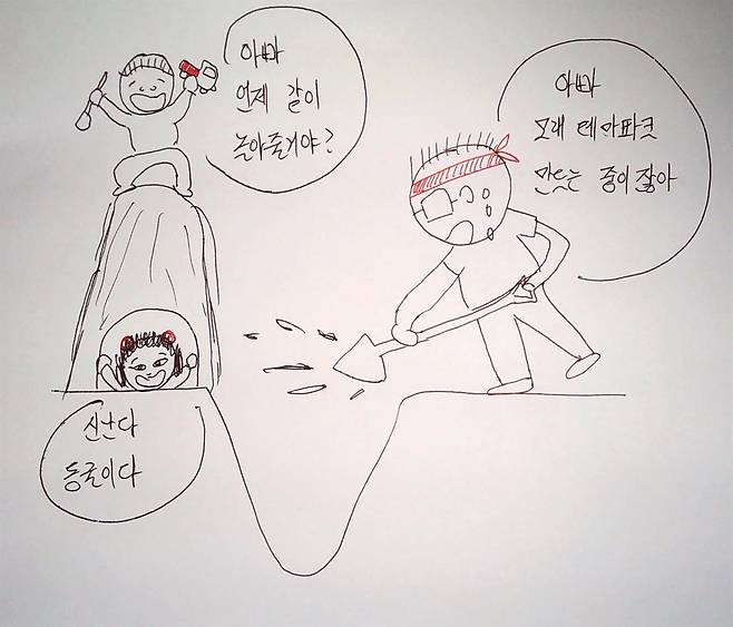 내가 할 수 있는 놀이를 찾기 시작했다. 그렇게 시작된 게 '삽질'이었다. 아들이 모래놀이를 할 때 아들이 갖고 노는 장난감 삽으로 땅을 파기 시작했다. 시작은 미약했으나 계속 파기 시작하자 제법 커졌다. 깊이 파다가 길을 만들었다. 땅을 파니 자연스레 산이 생겼다. 구덩이가 생기고, 산이 생기고, 길이 생기니 아들은 더 즐기며 놀았다.