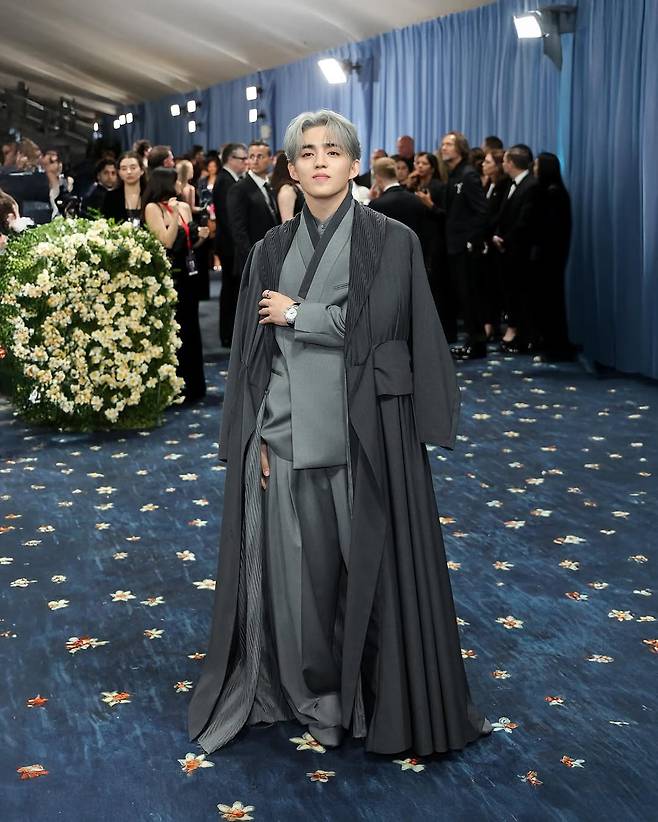 에스쿱스는 멧 갈라에서 한복에서 영감을 받은 커스텀 수트를 선보이며 정밀한 테일러링과 동양적 선이 어떻게 공존할 수 있는지를 보여주었다.