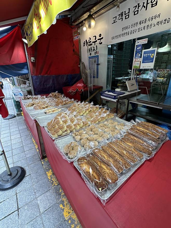 시장 한 켠에는 갓 구워낸 빵 냄새가 은은하게 퍼지는 작은 빵집이 있어요. 바로굽는 빵은 행정안전부 선정 착한 가격업소로 선정되었을만큼, 맛 만큼이나 가성비까지 뛰어난데요. 바로바로 튀겨주는 도너츠류와 추억돋는 크림빵, 앙금빵, 소보루빵까지 종류가 아주 다양하답니다. 그 중에서도 사과사다라빵, 생야채빵, 소세지야채빵, 햄버거는 꼭꼭 드셔보시는게 좋은데요. 늦게 가면 품절이 될 수 있으니 일찍 가시는 걸 추천해 드려요.