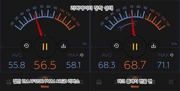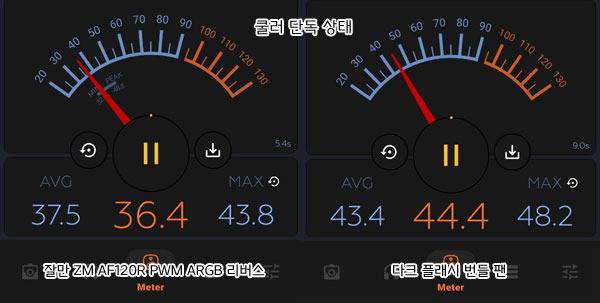그렇다면 소음은 어떨까? 참고로 테스트 시스템에서 다크플래시 DX-360 v2.6의 기본 쿨러의 속도는 약 1800RPM, 잘만 ZM AF120R PWM ARGB 리버스의 회전 속도는 약 1400RPM을 기록했다.