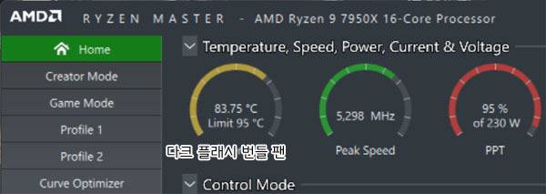 라이젠 9 7950X와 120mm 3열 일체형 수랭 쿨러인 다크플래시 DX-360 v2.6을 이용해 확인했다. 이때 쿨러의 속도는 최고 속도로 고정한 상태로, 성능은 시네벤치 2024의 스트레스 테스트를 이용해 확인했다.