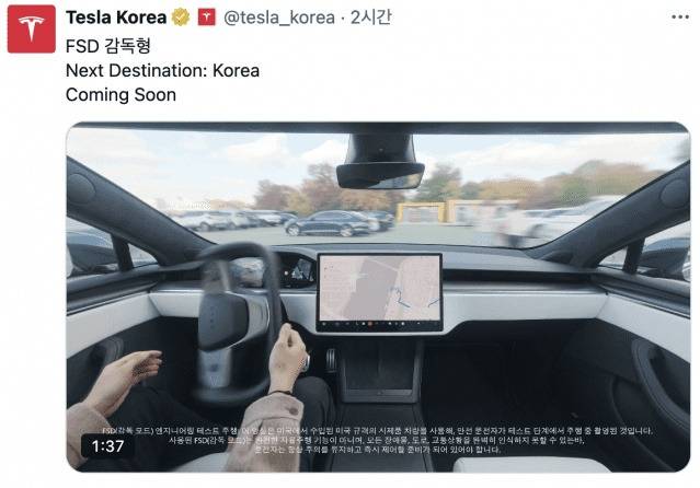 테슬라코리아는 공식 엑스(X·옛 트위터) 계정에 “FSD 감독형 다음 목적지: 한국, 곧 출시(Coming Soon)”라는 게시물을 올렸다. 게시물에는 한국 도심 한복판에서 FSD를 실제 작동시킨 영상이 함께 공개됐다. 영상 속 테슬라 차량은 복잡한 도심 도로를 스스로 주행하며 차선 변경부터 주차까지 능숙하게 해낸다. 운전자는 핸들 위에 가볍게 손을 올려둔 채 차량이 내비게이션을 따라 목적지까지 안전하게 도착하는 모습을 지켜보기만 했다.
