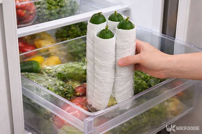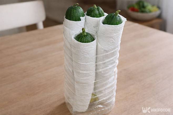 오이는 하나씩 키친타월로 감싼다. 겉에 맺힌 물기를 정리해 주고, 내부 수분이 갑자기 빠져나가지 않도록 완충 역할을 한다. 종이가 수분을 적당히 흡수하면서 표면 상태를 일정하게 유지해 준다. 여러 개를 한 번에 넣기보다는 서로 닿지 않게 세워 담는 편이 낫다. 채소끼리 밀착되면 닿은 부분부터 쉽게 물러질 수 있기 때문이다.